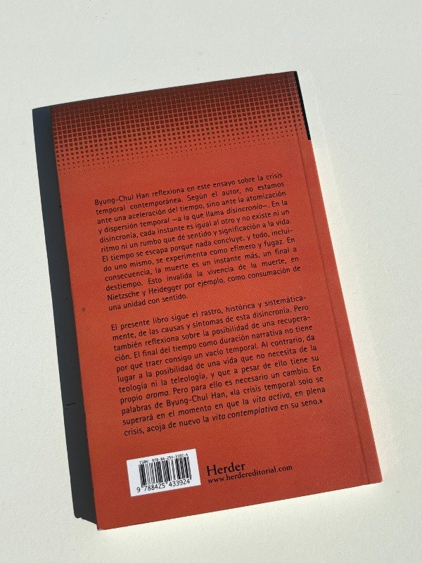 El presente libro sigue el rastro, histórica y sistemáticamente, de las causas y síntomas de esta disincronía. Pero el final del tiempo como duración narrativa no tiene por qué traer consigo un vacío temporal. Al contrario, da lugar a la posibilidad de una vida que no necesita de la teología ni la teleología, y que a pesar de ello tiene su propio aroma. Pero para ello es necesario un cambio. En palabras de Byung-Chul Han, «la crisis temporal solo se superará en el momento en que la vita activa, en plena crisis, acoja de nuevo la vita contemplativa en su seno.»